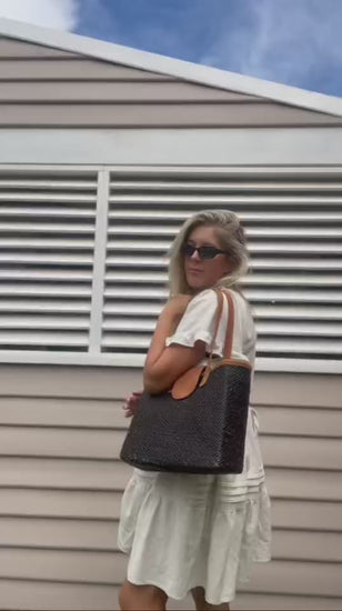 This black seagrass tote with leather handles is designed for both sophistication and everyday utility. Featuring a structured woven body, tan leather trim, and versatile carrying straps, it’s a perfect companion for work, weekends, or travel. Spacious yet elegant, it balances fashion with purpose.